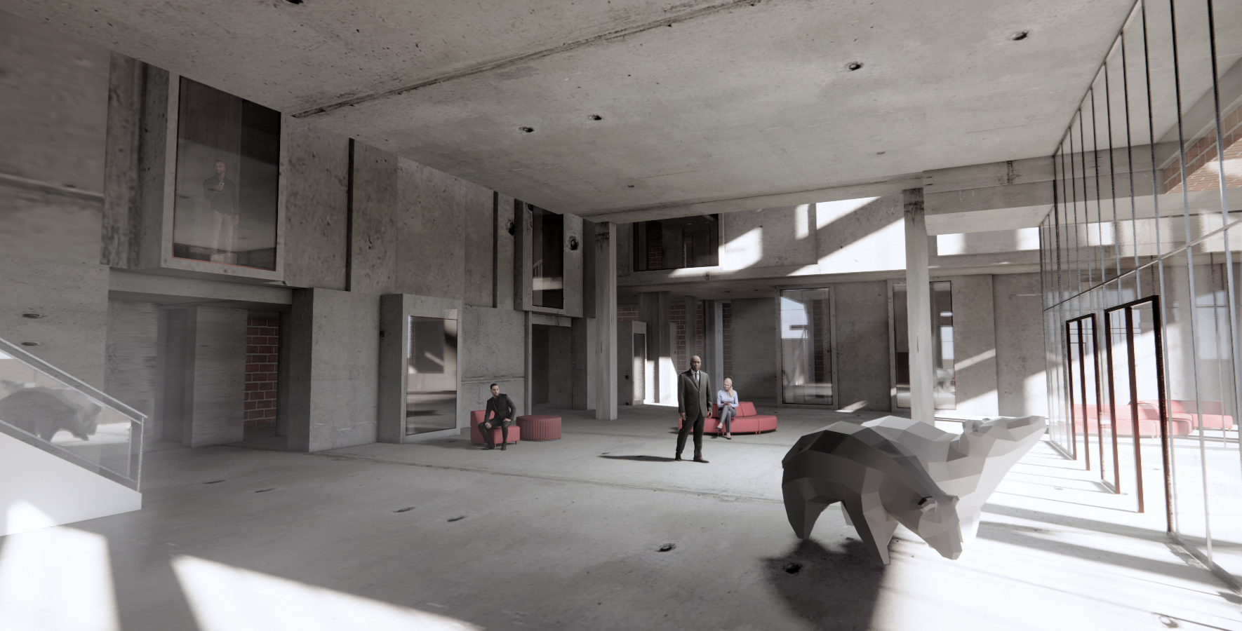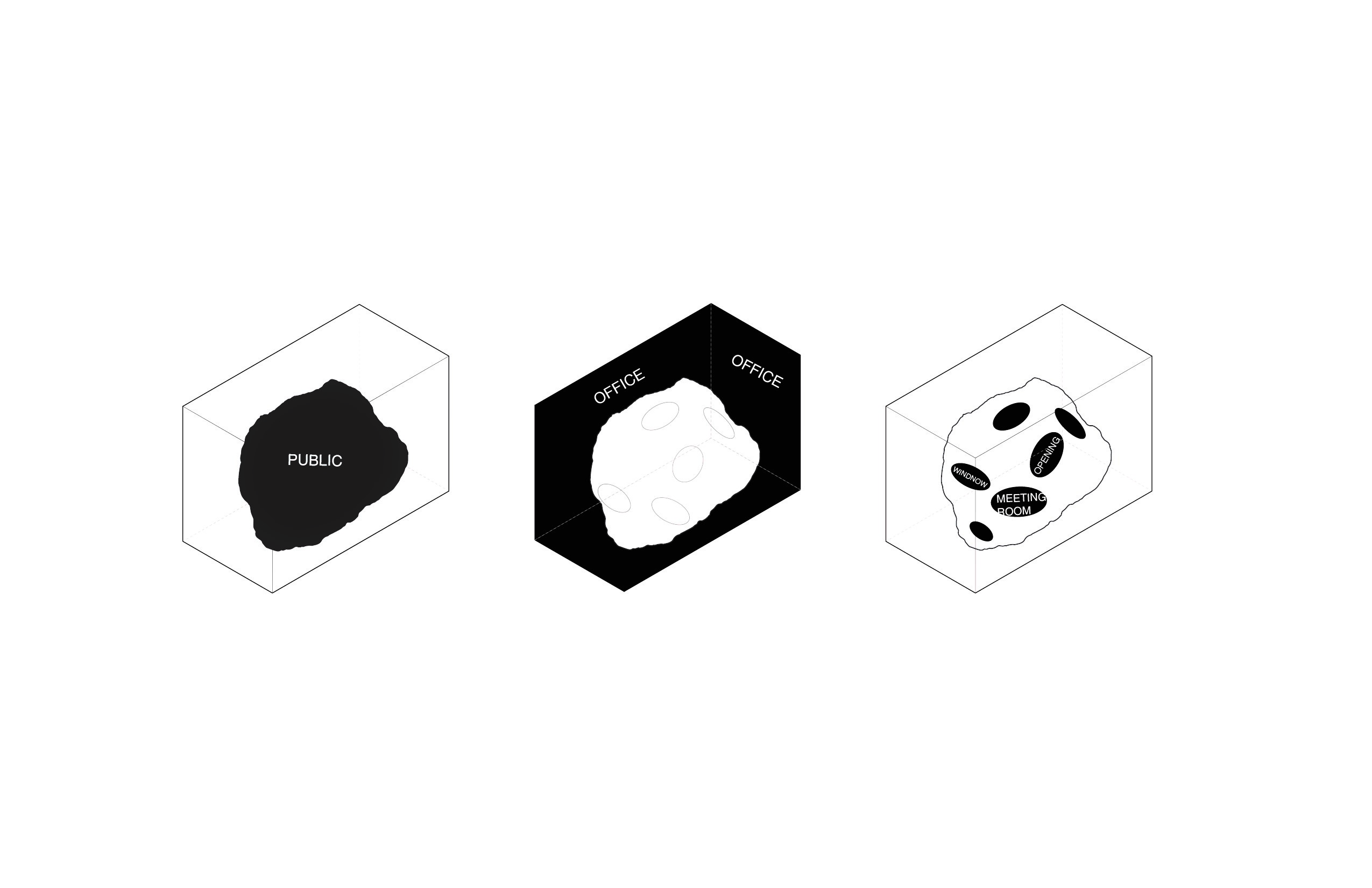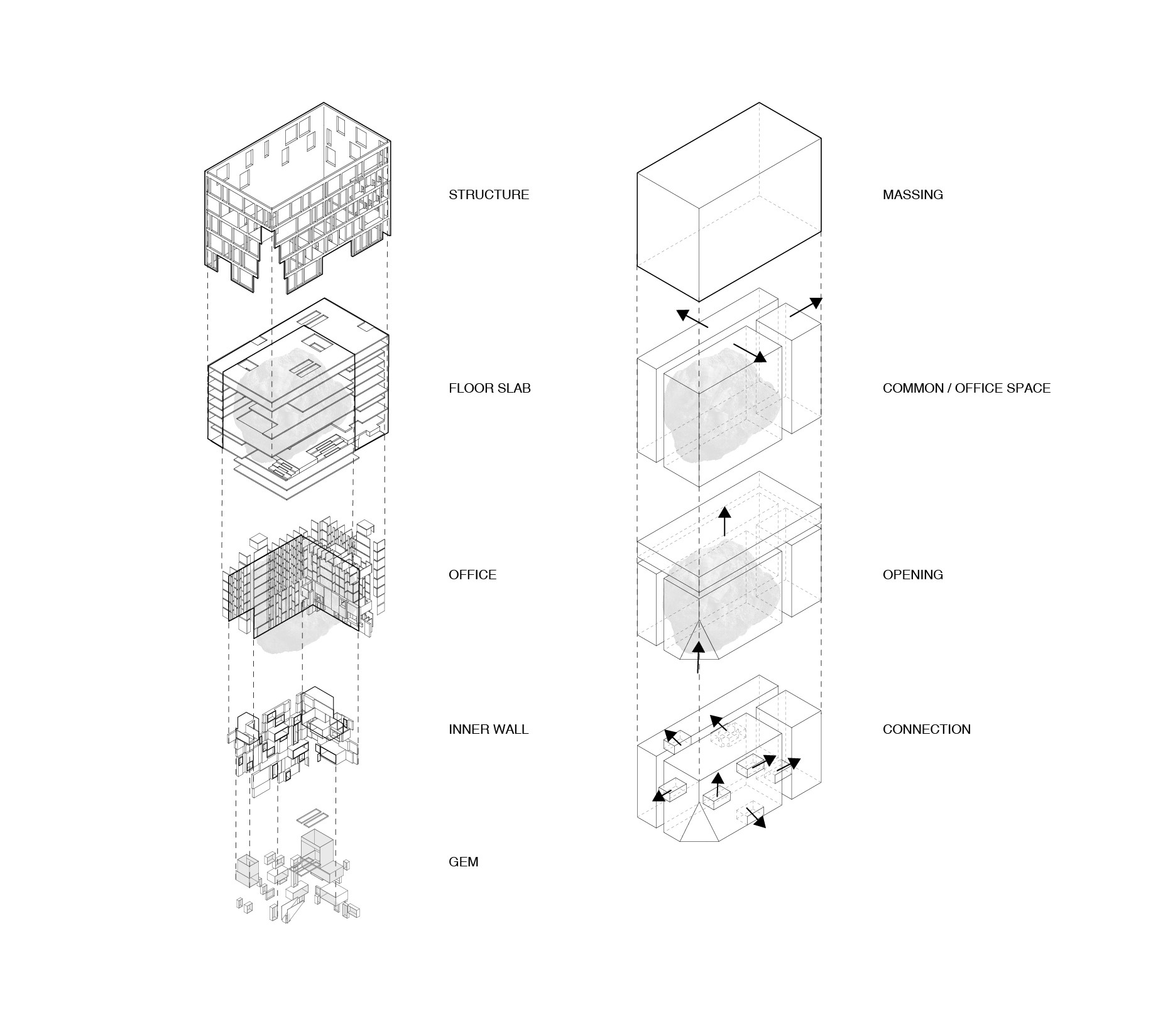 The building is subdivided into 4 elements: circulation stairs, the copper coated meeting space, the slabs and facades. The meeting space penetrated through the private office to the public space. And the facade supports the long cantilever of the floor span.