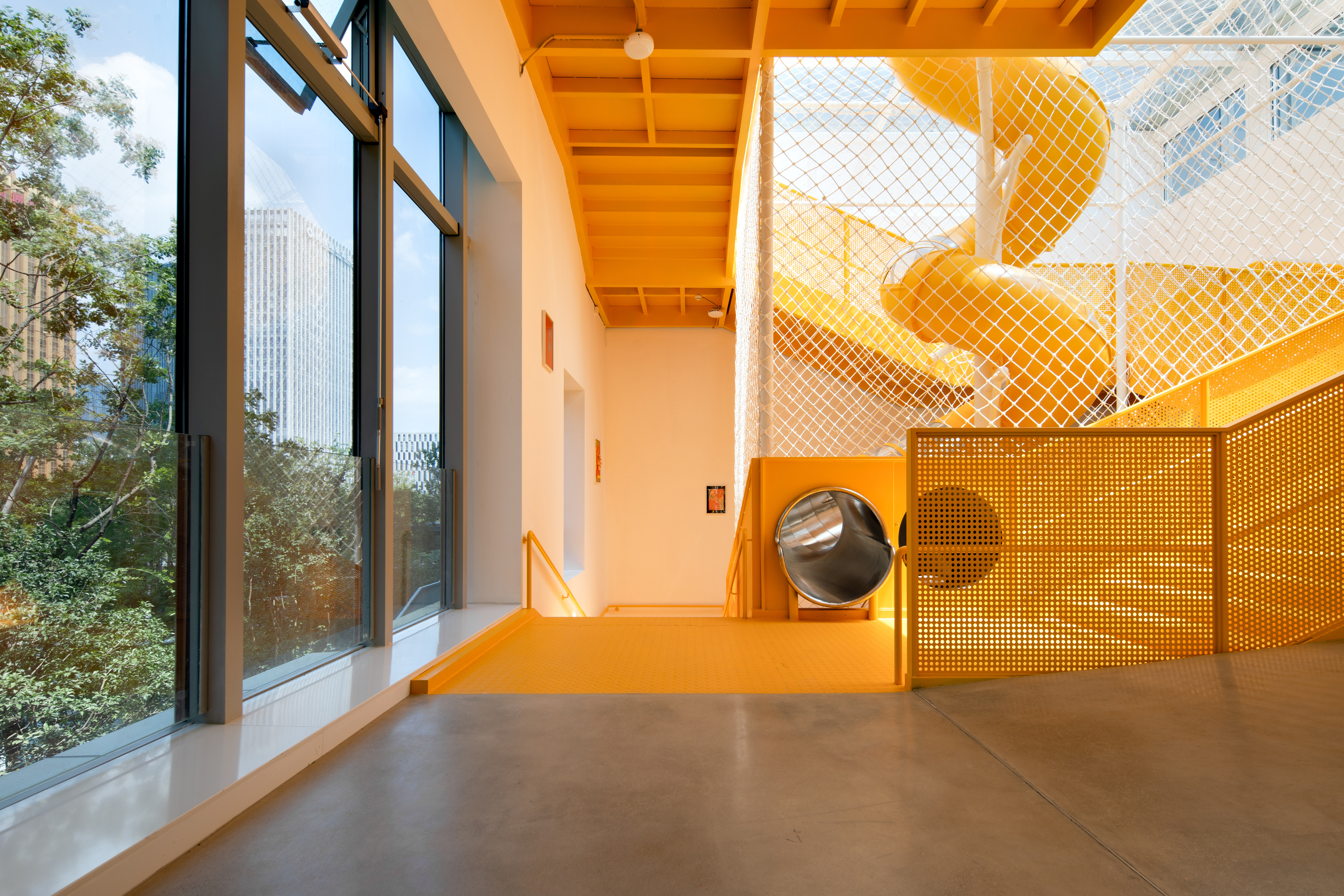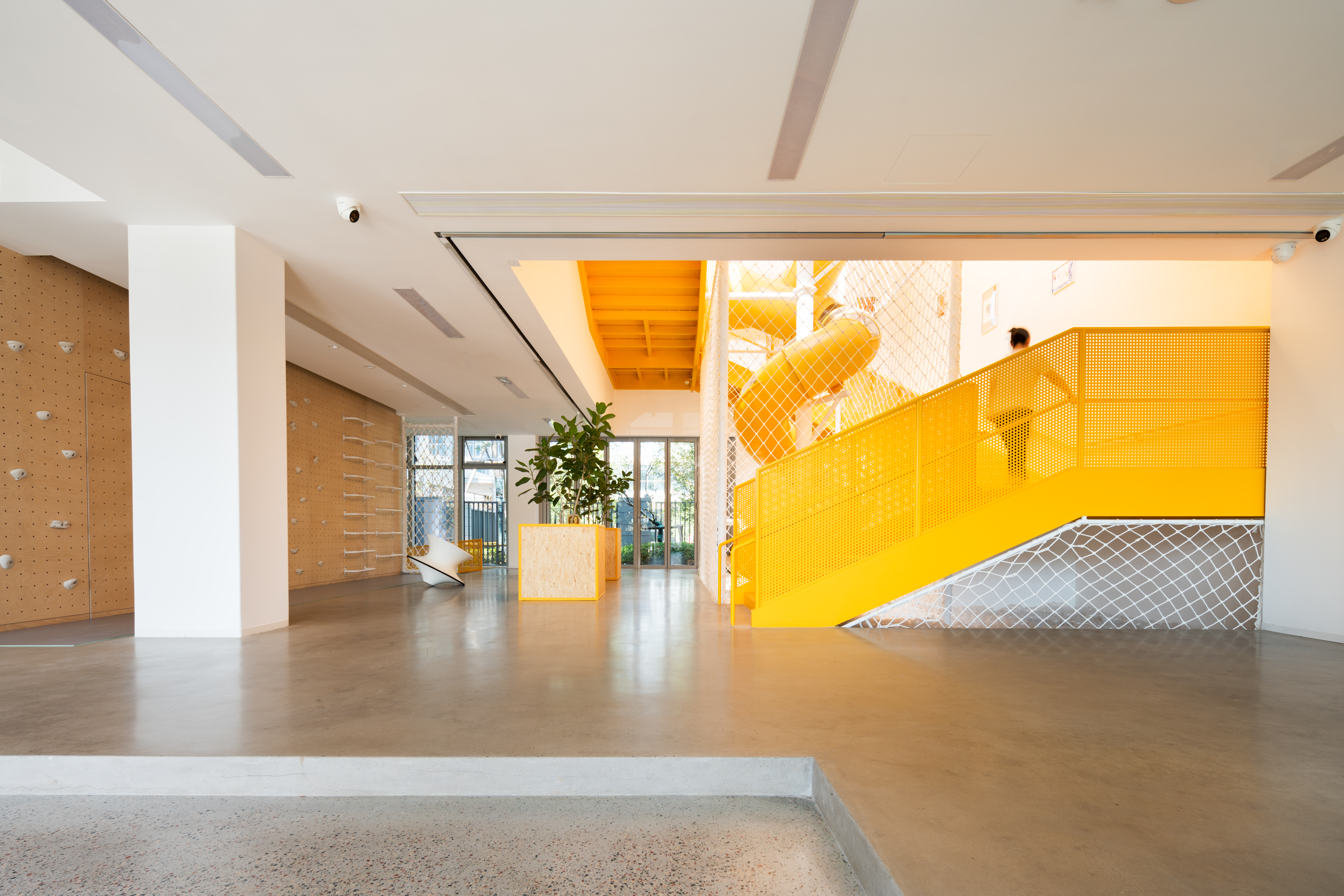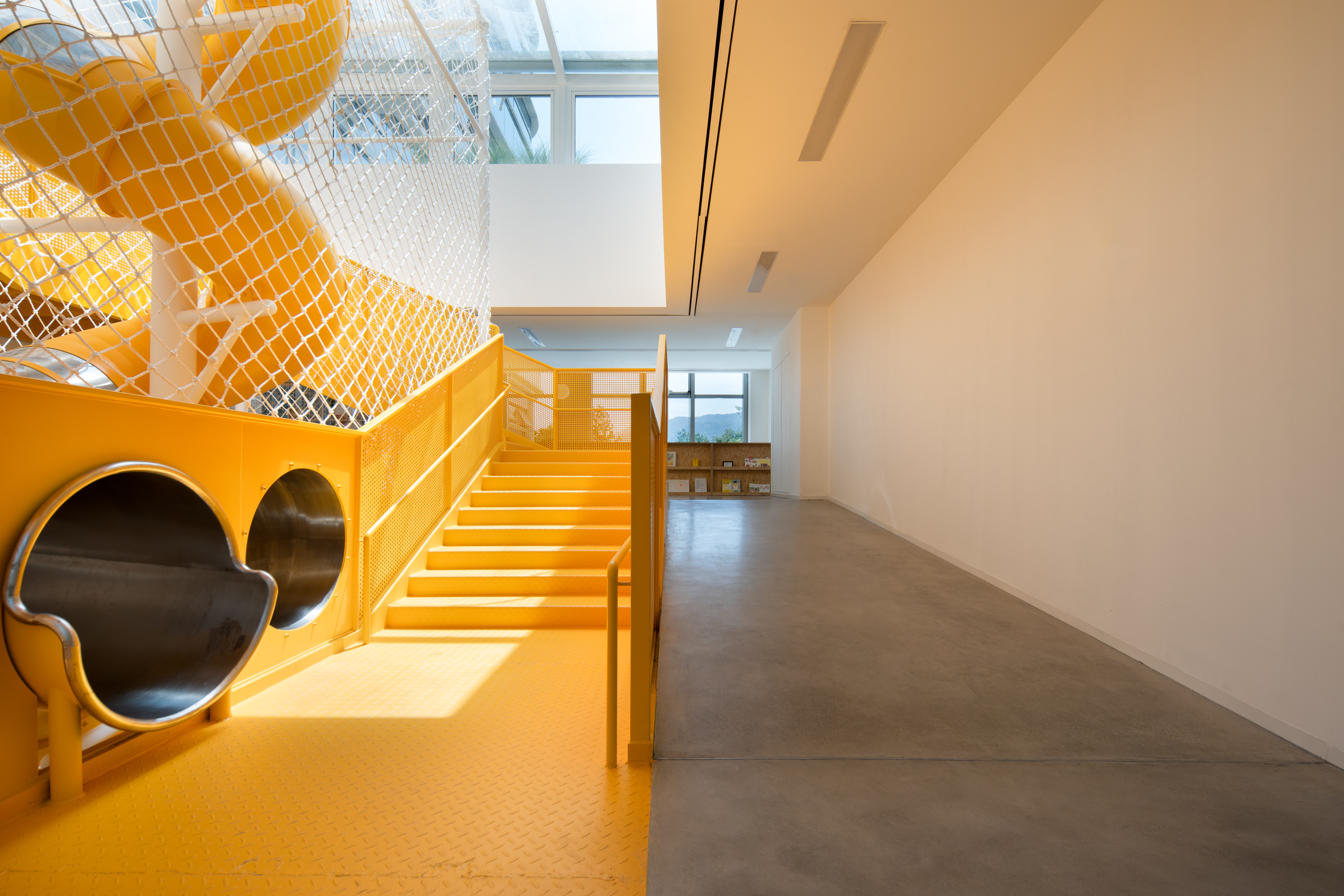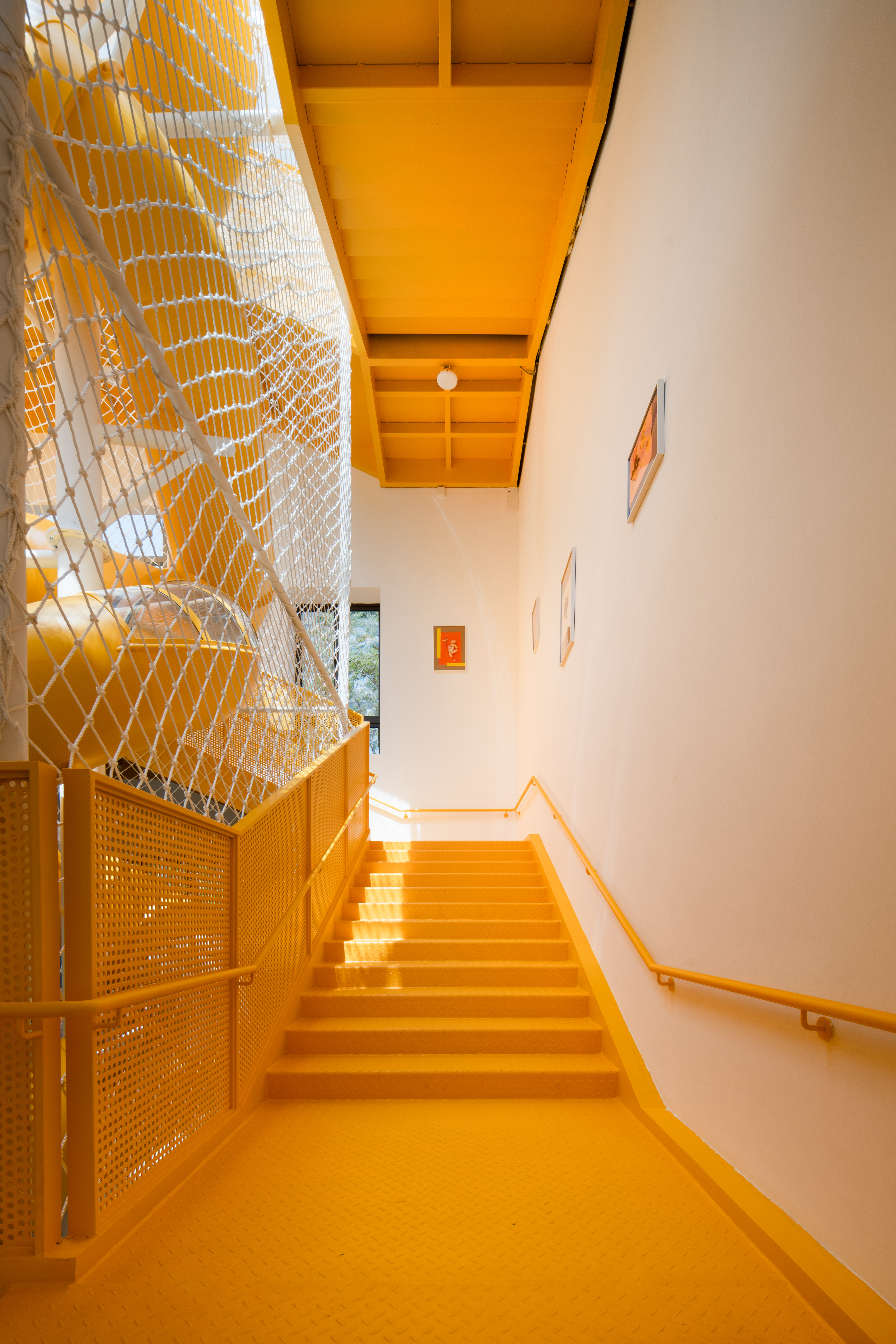 The visual center at the entrance of Unity Preschool is a large, three-story, bright yellow staircase. A large spiral slide is inserted into the stairwell, along with a sky well leading to the roof top. Bright yellow the themed color of the preschool, representing vitality, the rising sun, warmth, brightness, and happiness in life. The light steel frame structure contrasts sharply with the heavy concrete flooring, showcasing the intricate architectural structure and spatial interplay to children. This allows them to experience the transition between different-sized spaces and the geometric transformations of light and shadows created by the stairs and light.