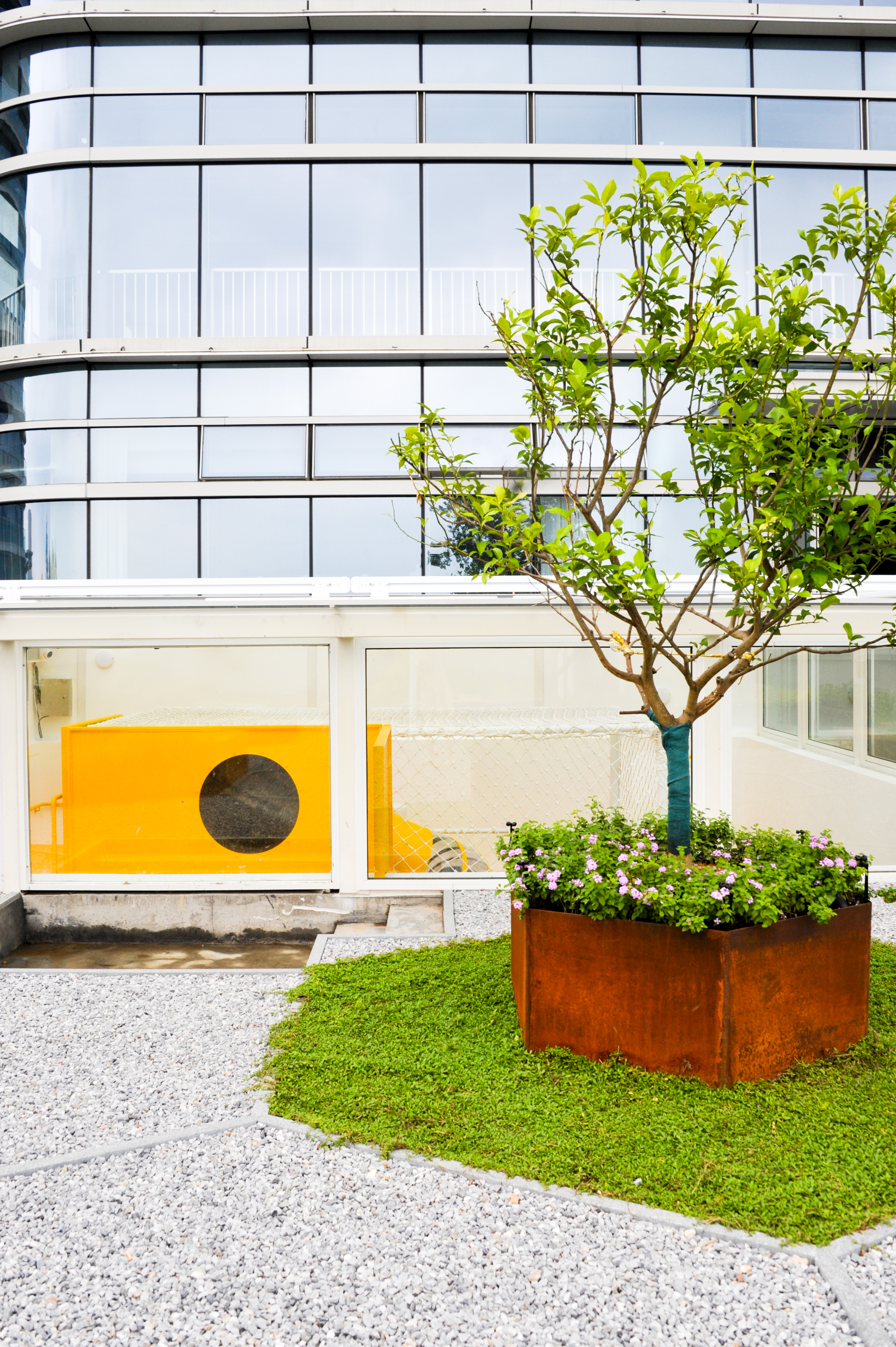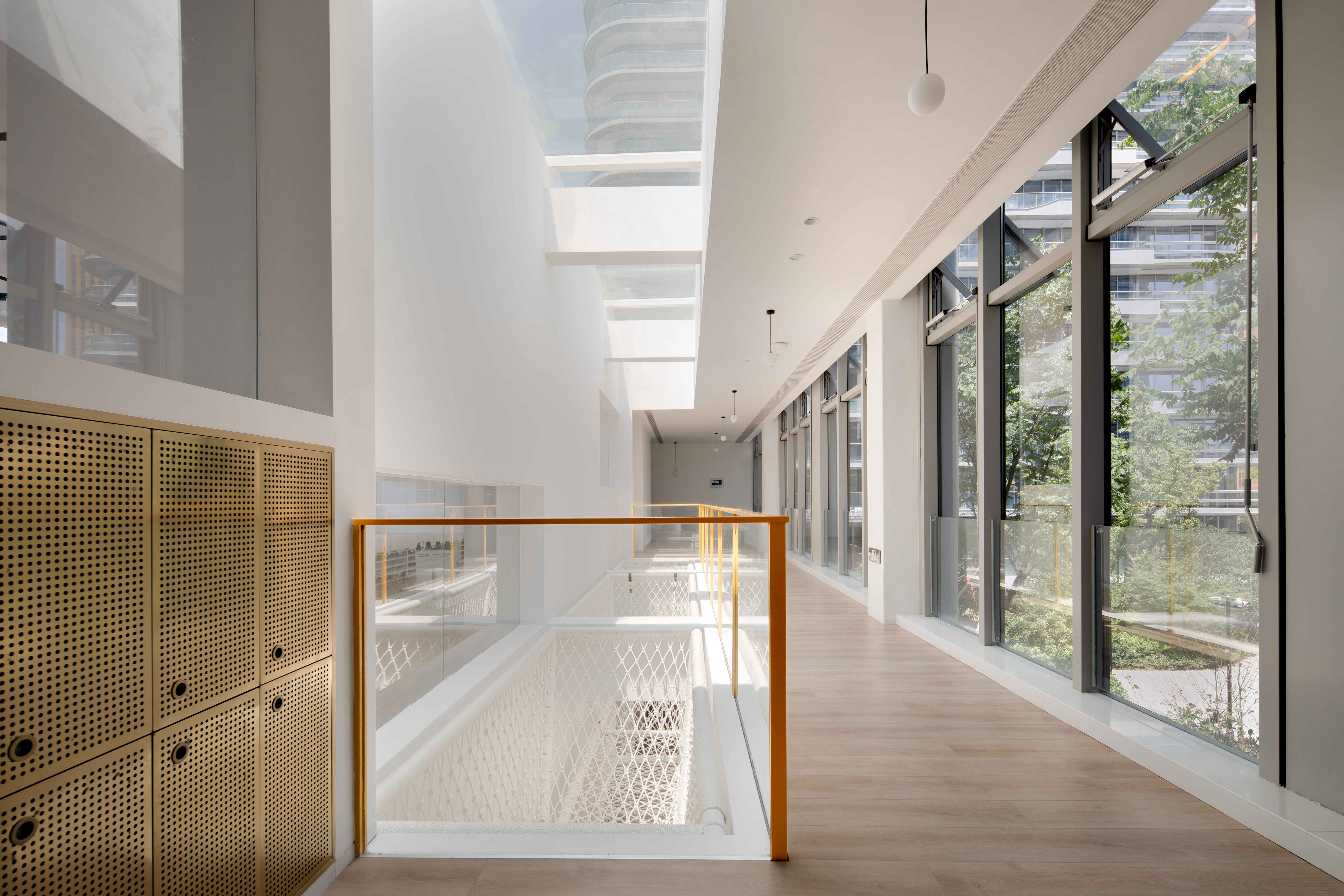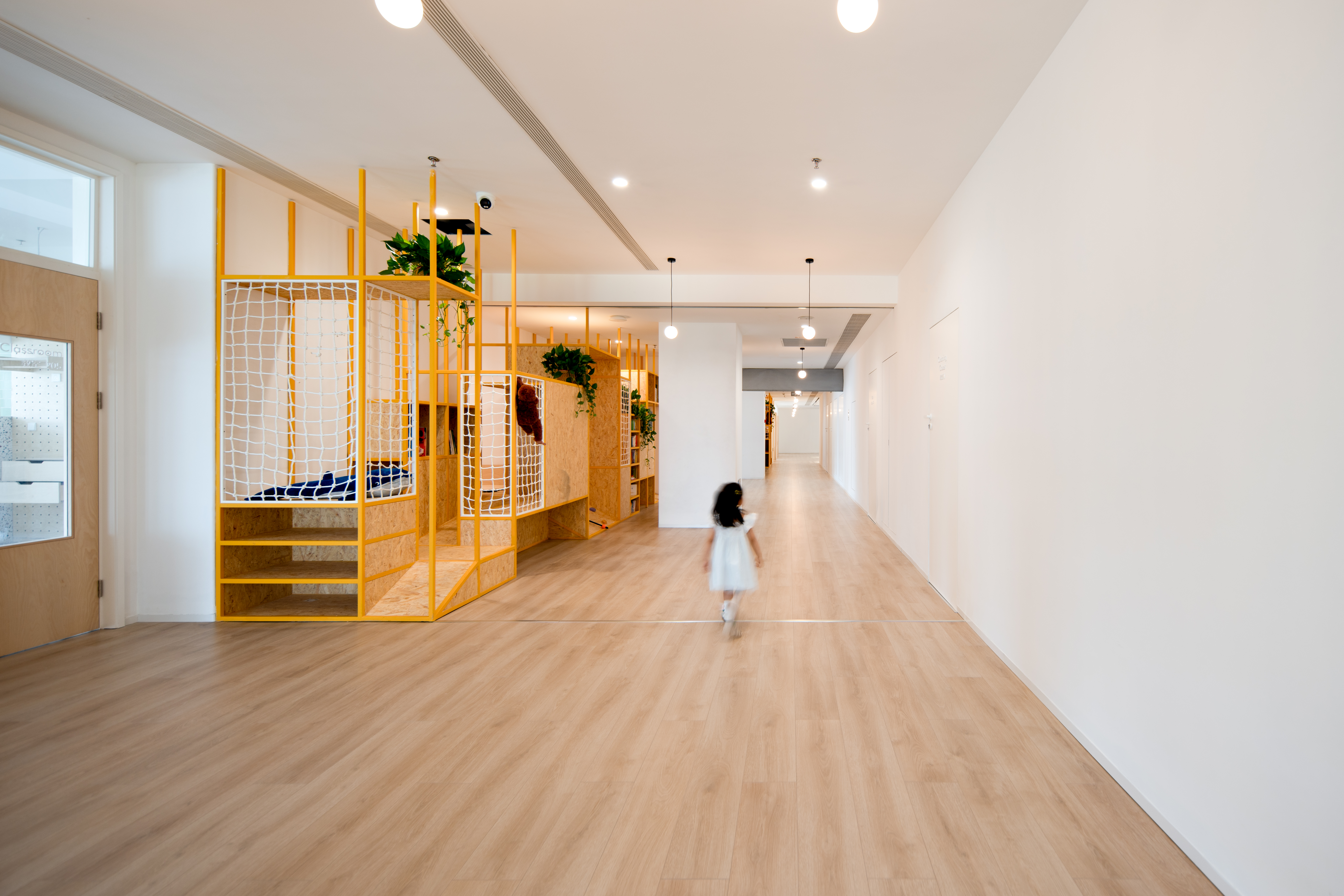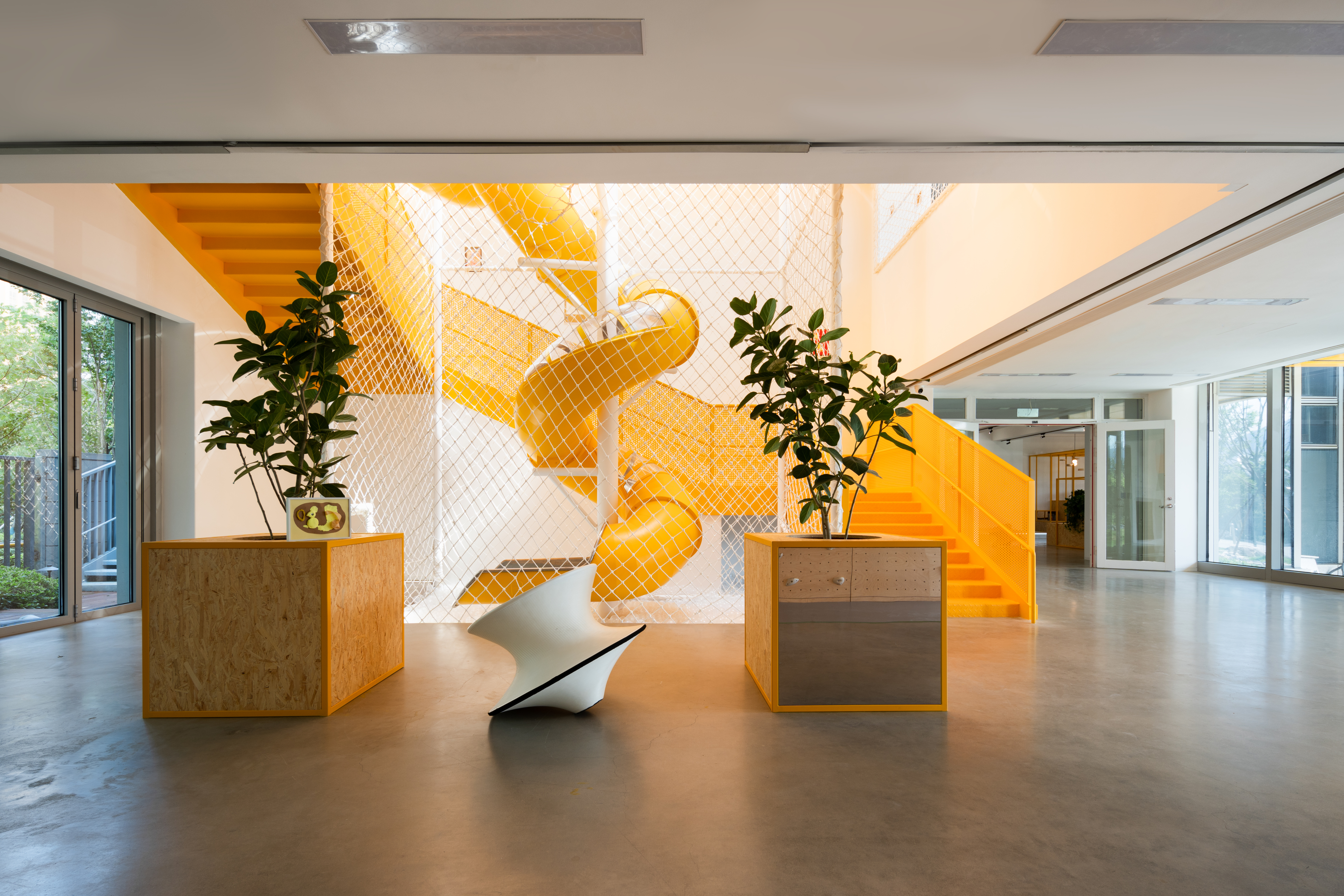 The visual center at the entrance of Unity Preschool is a large, three-story, bright yellow staircase. A large spiral slide is inserted into the stairwell, along with a sky well leading to the roof top. Bright yellow the themed color of the preschool, representing vitality, the rising sun, warmth, brightness, and happiness in life. The light steel frame structure contrasts sharply with the heavy concrete flooring, showcasing the intricate architectural structure and spatial interplay to children. This allows them to experience the transition between different-sized spaces and the geometric transformations of light and shadows created by the stairs and light.