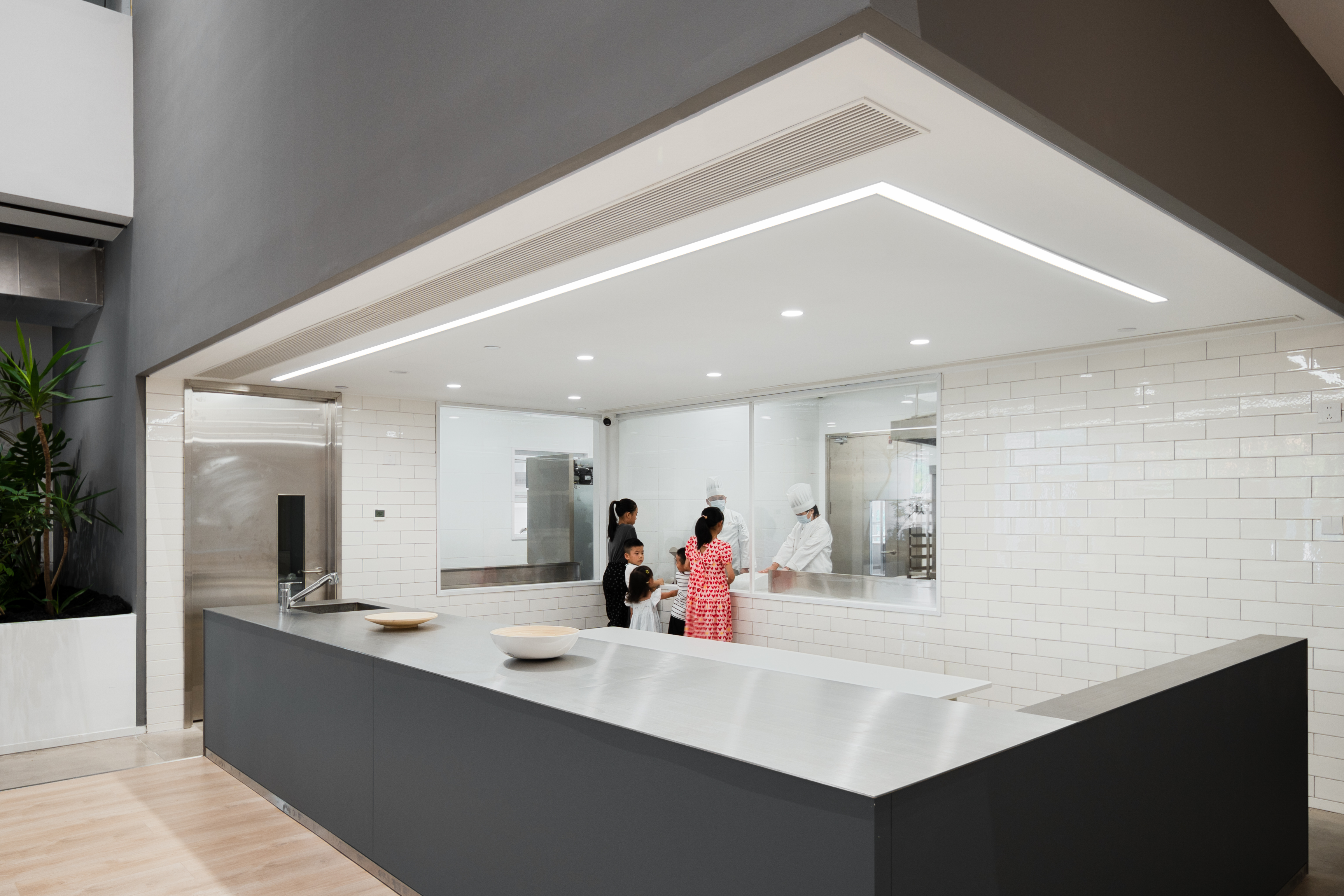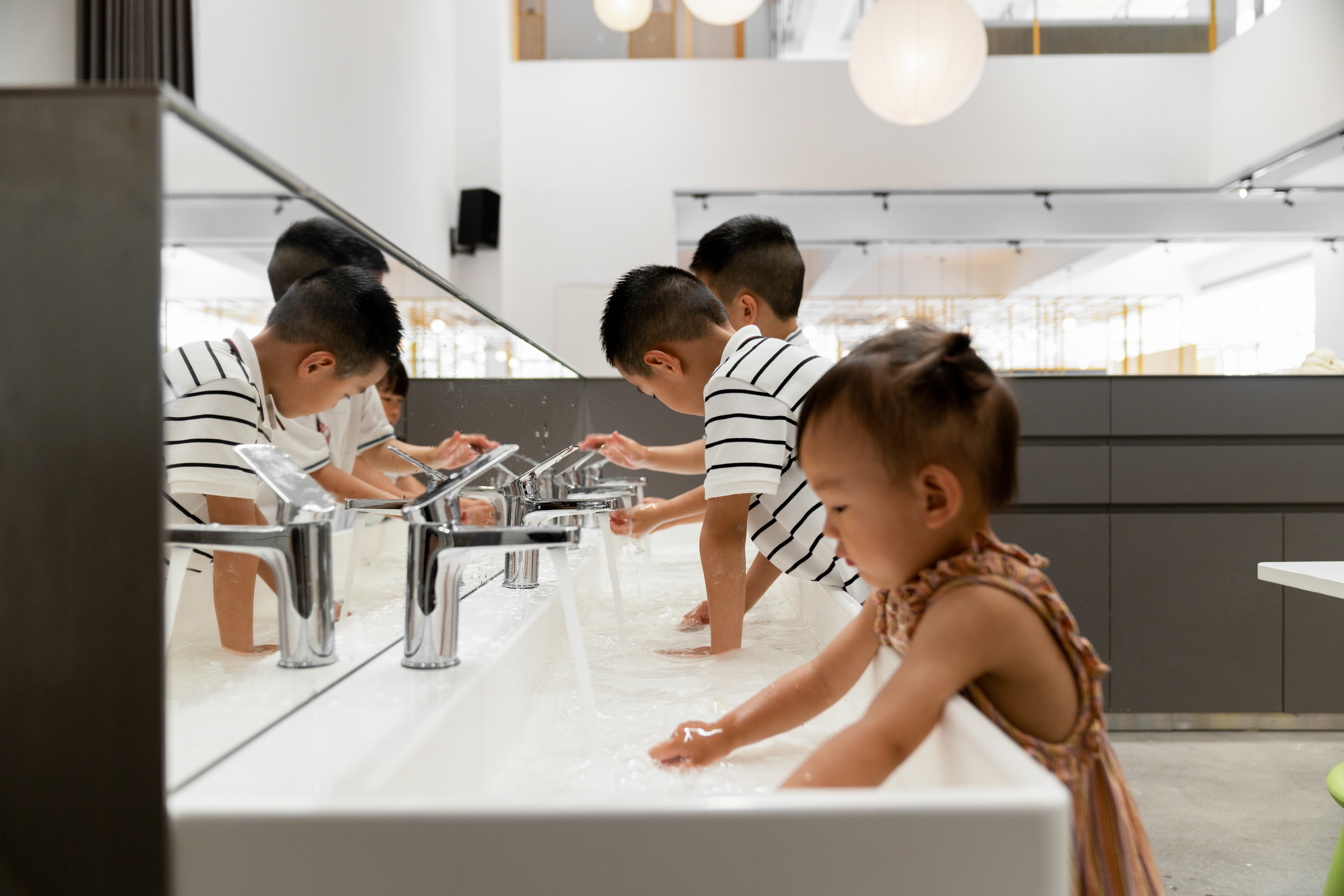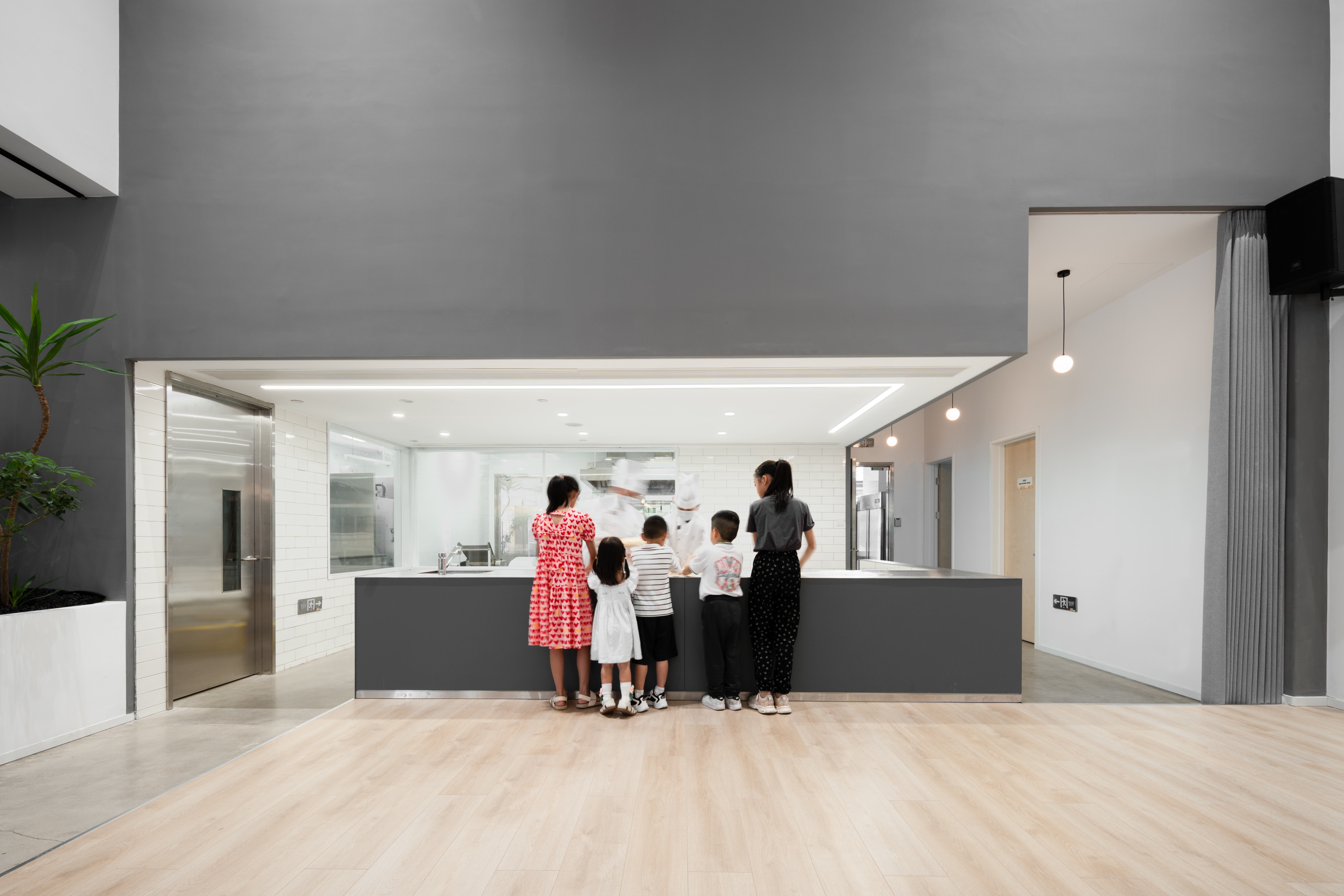 The kitchen at Unity Preschool serves not only as a place to prepare meals but also as an integral part of the educational experience. We have employed a design with a full-wall transparent glass, allowing children to witness the entire cooking process. The kitchen area is adjacent to the family-style dining area in the Piazza, enabling a structured flow of cooking, arrangement, serving, dining, and recycling, all within the same space. Through this design, children can systematically understand the origin of food and actively participate in the entire food preparation process.