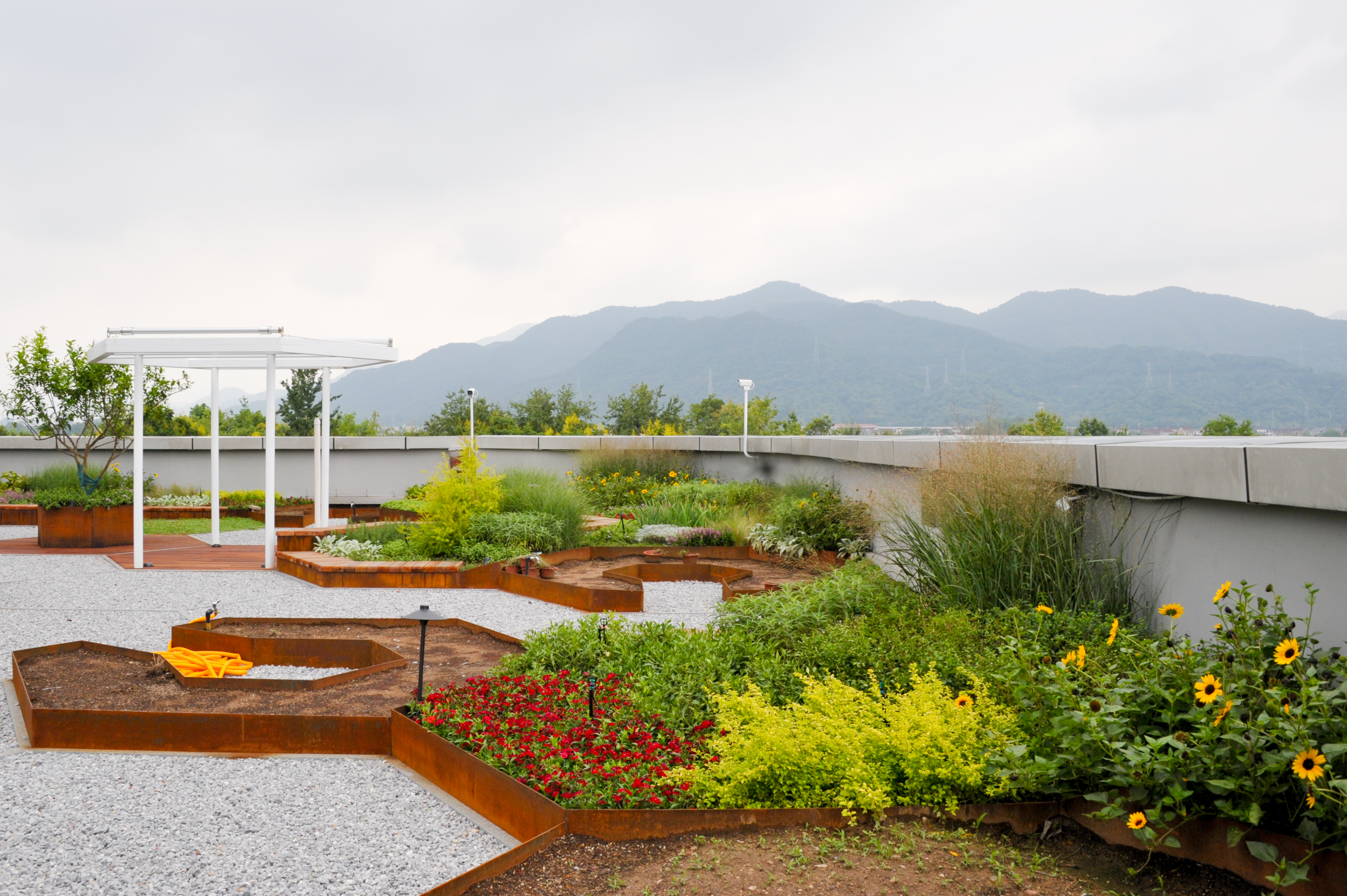The rooftop garden is a crucial space designed to stimulate children's five senses and their overall sensory development. We have incorporated numerous flowerbeds in the rooftop garden, primarily filled with various herbs, flowers, and shrubs for children to touch, smell, gather, and observe. Additionally, each class has its own vegetable garden, where, under the guidance of teachers, children plant various vegetables and fruits as part of their research themes. The children are involved in every stage, from sowing seeds to watering, fertilizing, and harvesting. To ensure a comfortable experience, especially during the summer, we have integrated a mist cooling system and canopies over activity zones for physical cooling.