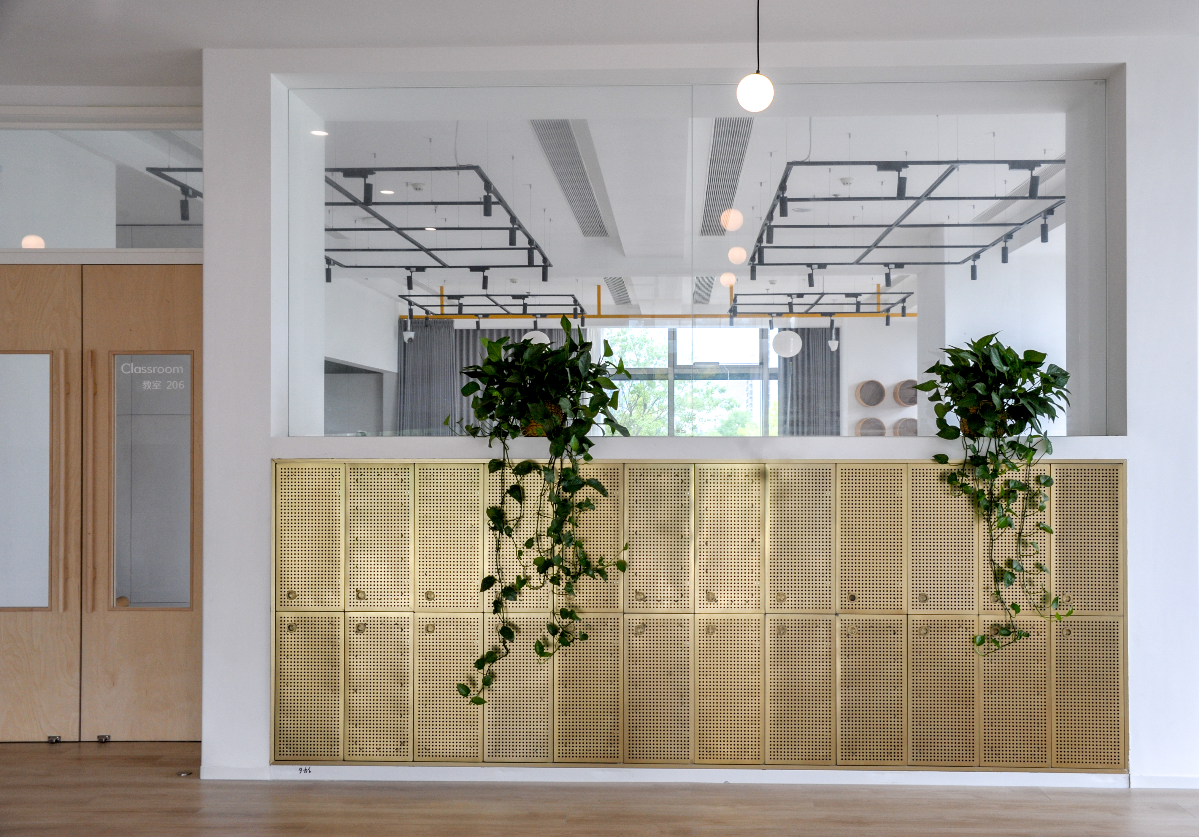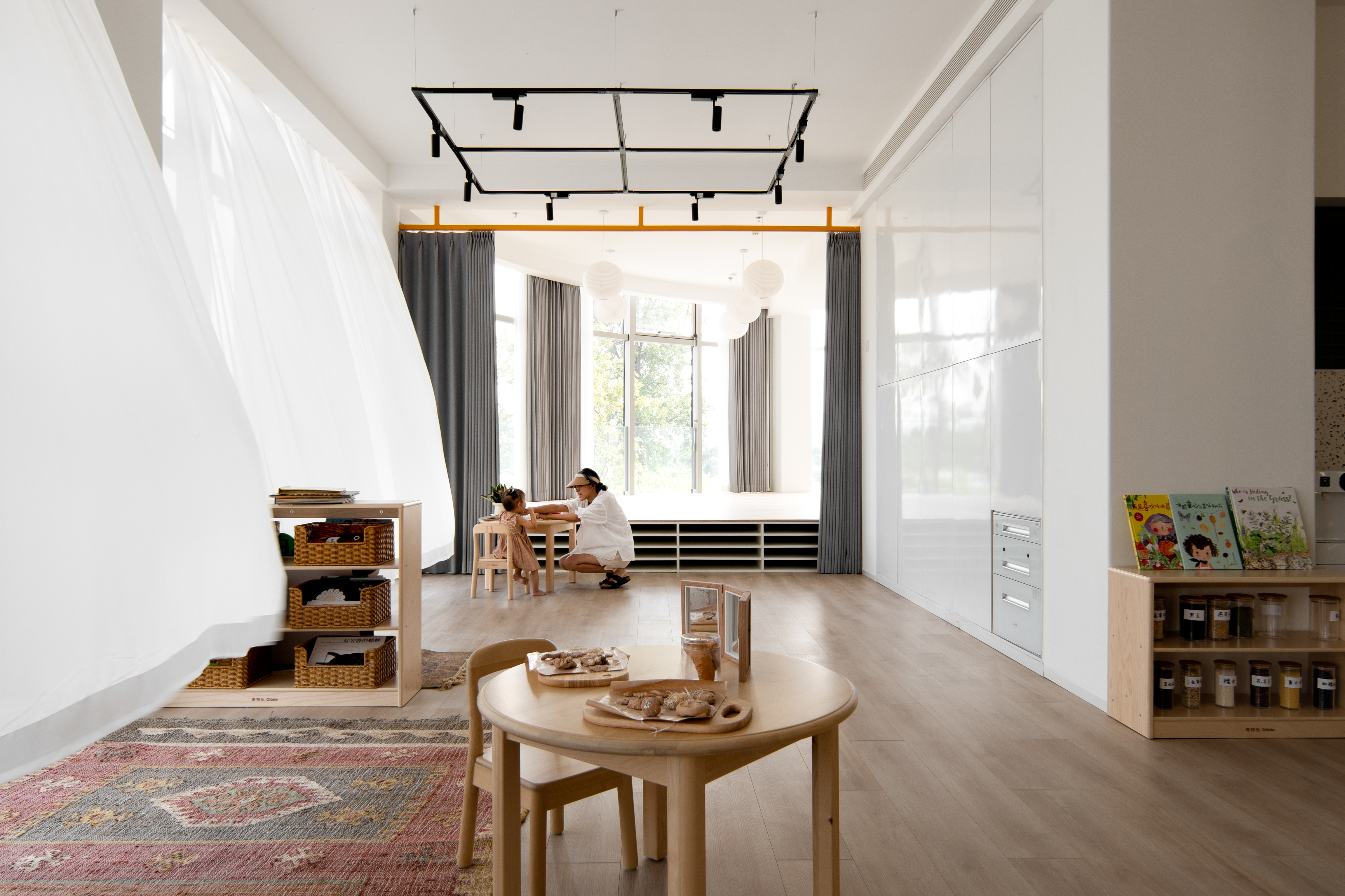Natural light is a crucial factor for the physical and mental well-being of children. Therefore, all classrooms at Unity Preschool are equipped with full-length windows and natural materials. The large glass windows in the corridors are designed at two different heights for adults and children, providing varying visual connections between the interior and exterior of the classrooms. In line with the Reggio Emilia Approach, children's works and educational materials should not be confined to two-dimensional surfaces. Hence, we have incorporated magnetic wall cabinets, wooden tool walls, and grid-like track lighting for hanging materials, allowing children to create and learn in the three-dimensional space within the classroom. Tongxin integrates all furniture and facility designs with our educational philosophy.