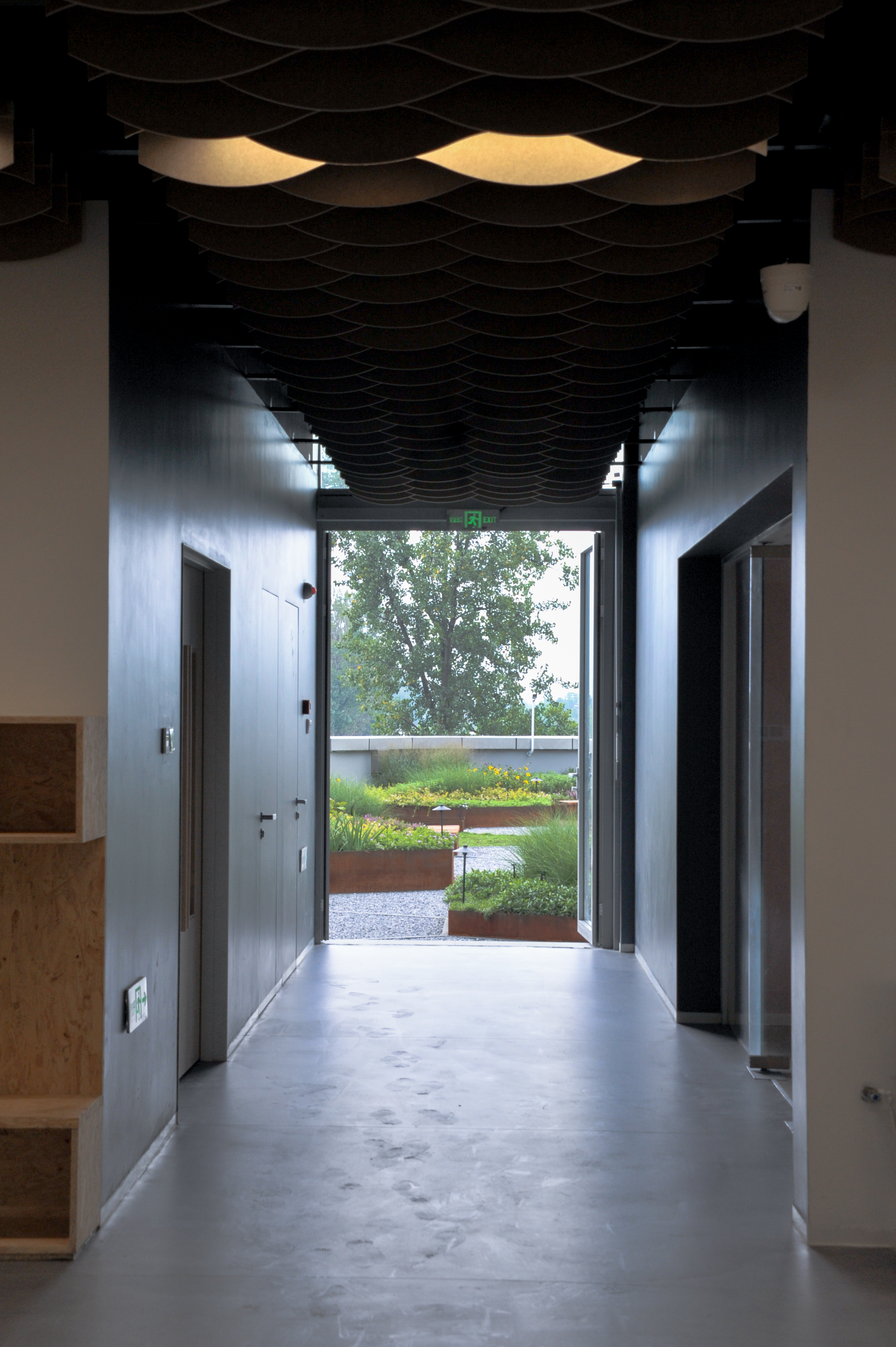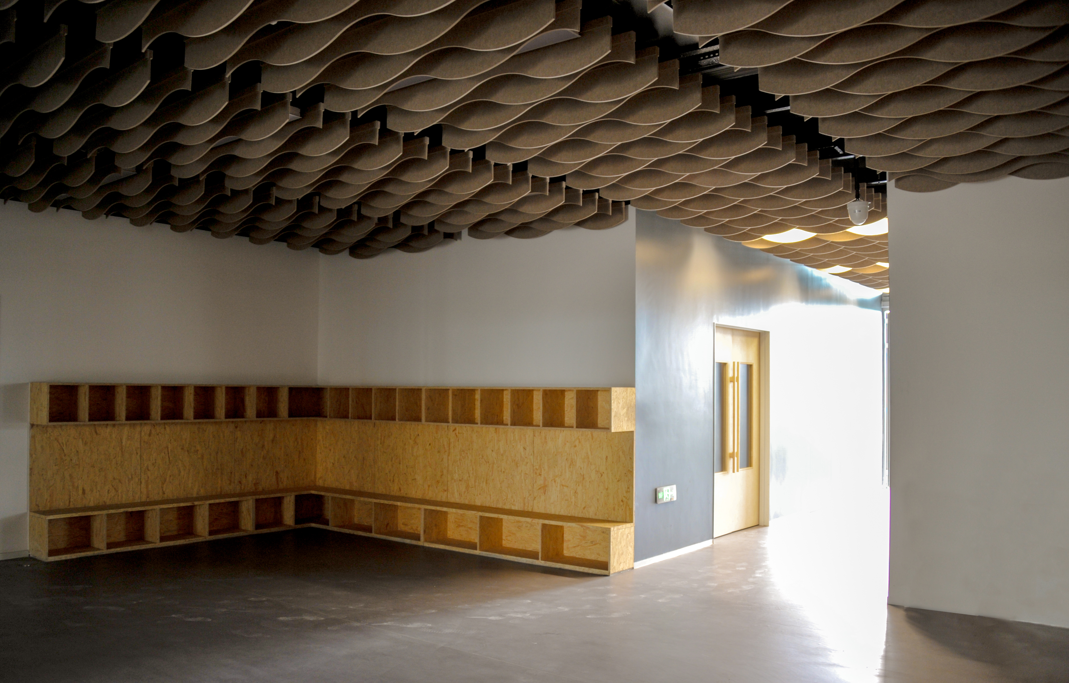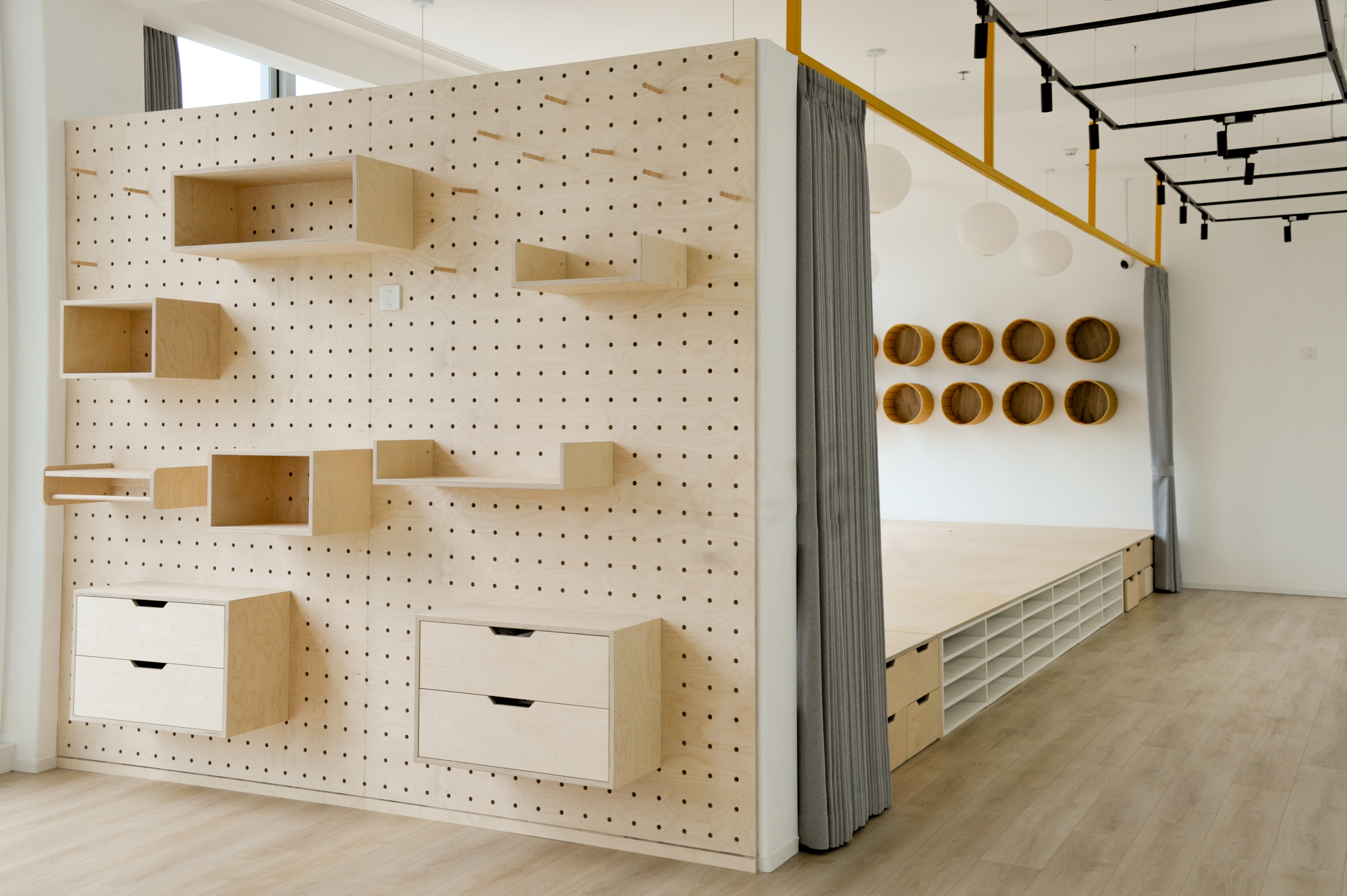 The art studio at Unity Preschool is designed to provoke curiosity and wonder. The large wall-embedded glass shelves display a wide range of diverse and natrual materials inside and outside of art studio. The space is open, allowing children to move freely and engage with different materials and stations. The Indoor activity room seamlessly connects to the outdoors, and the top is equipped with sound-absorbing felt panels that not only protect the children's hearing but also incorporate a wave-themed design element. This design allows children to experience the geometric variations in the top space, adding an engaging dimension to their sensory experience.