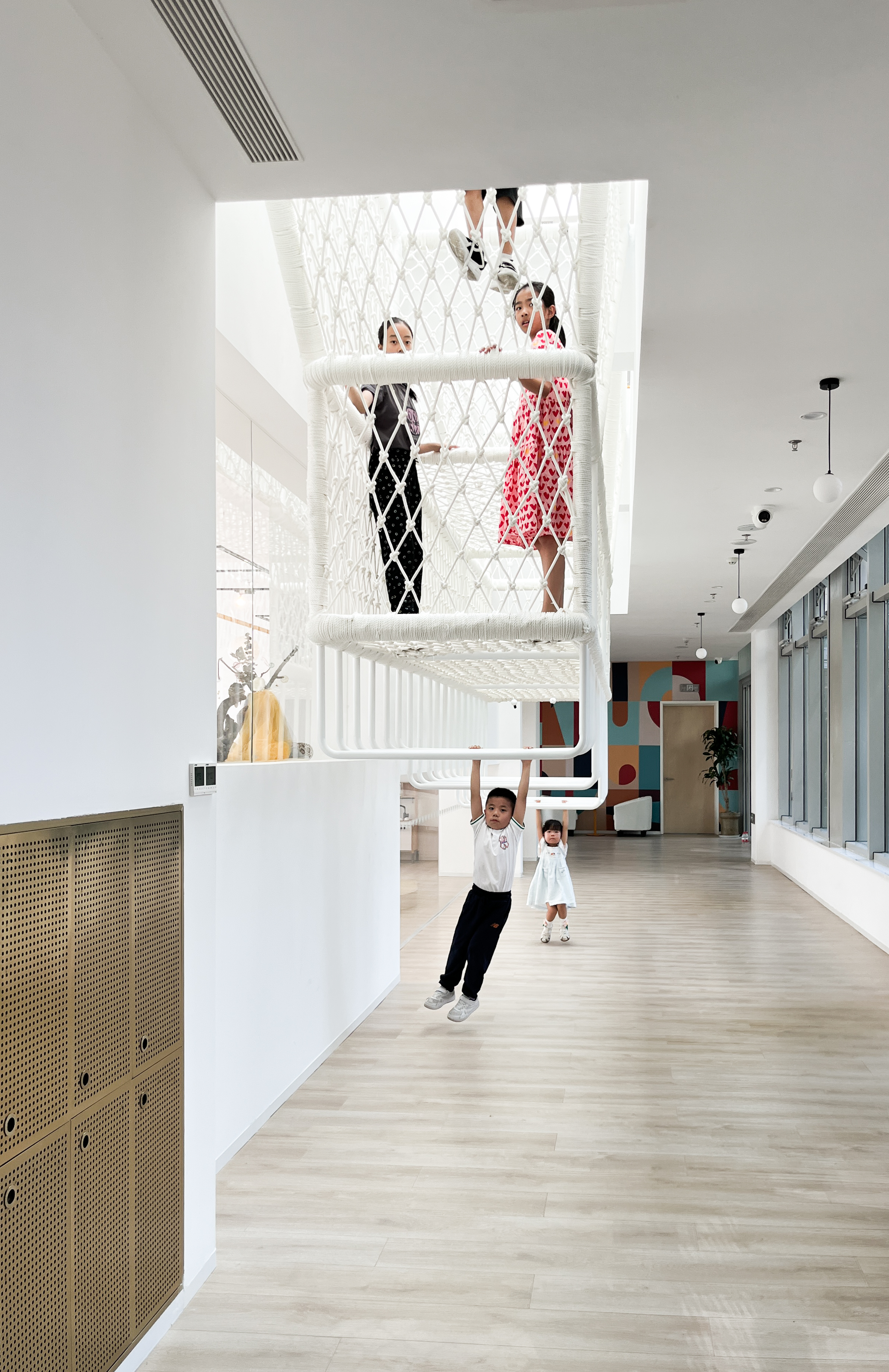 We have designed a three-story large climbing structure that spans the entire kindergarten, allowing children to freely move through different floors and heights, promoting physical coordination and fitness. Moreover, it encourages interaction and socialization among children on various levels. For example, children on the second floor can directly interact with those on the first floor through the climbing structure, and children in the rooftop garden on the third floor can observe children climbing on the lower levels. This enhances the children's awareness of spatial connection and interaction, creating a diverse environment for communication and learning.